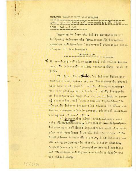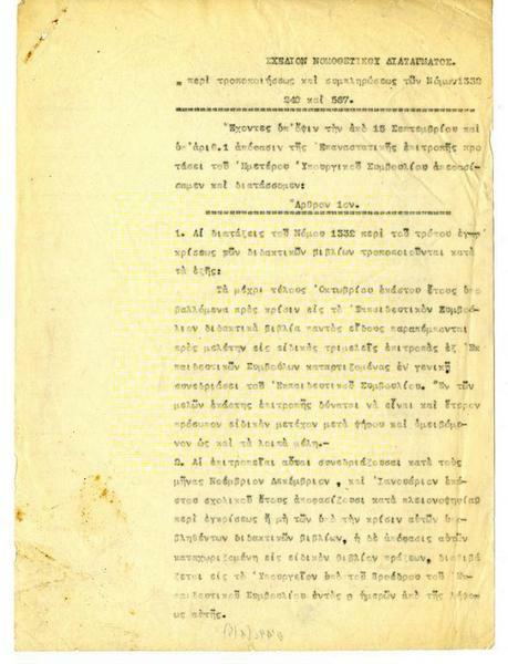 Σχέδιον Νομοθετικού Διατάγματος "Περί τροποποιήσεως και συμπληρώσεως των Νόμων 1932, 240 και 567"